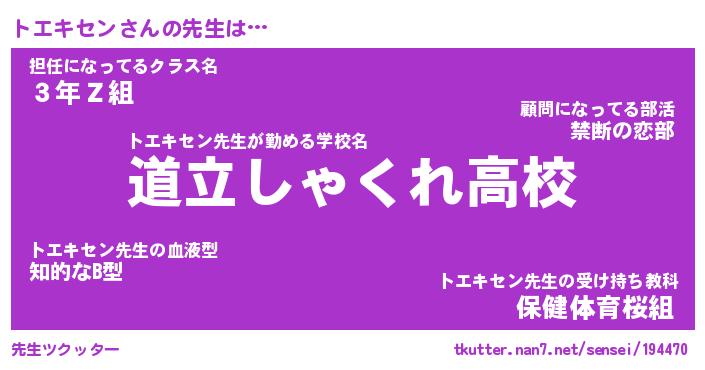 | ヒーロー風カッコイイあだ名 | 『スーパートエキセン』『銀牙騎士トエ』 |