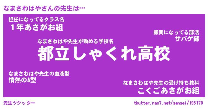 | ヒーロー風カッコイイあだ名 | 『スーパーナマサワハヤ』『幻影騎士ナマ』 |