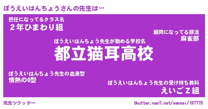 | 男性向けラノベタイトル風あだ名 | 『ボウエイハンチョウアートオンライン』 |