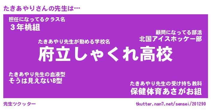 | 肩書あだ名 | 『たきあやり御曹司』『たきあやり塾長』 |