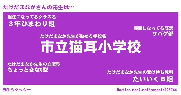 | ヘコむあだ名 | 『たけにー』『豆乳』『たけ太郎』 |