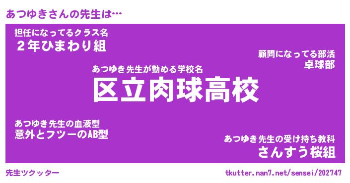 | 意味不明あだ名 | 『ペロリンあつゆき』『永久保存あつゆき』 |