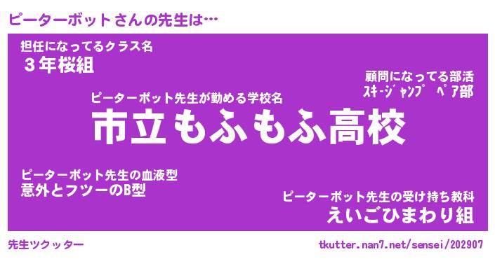 | 女子向けラノベタイトル風あだ名 | 『(仮)ピーターボットのやんごとなき事情』 |