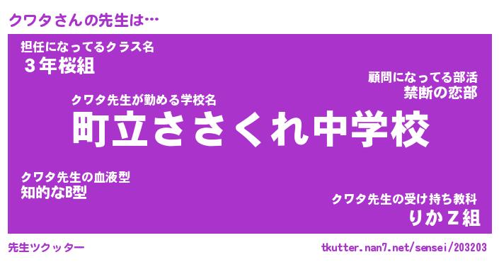 | ヒーロー風カッコイイあだ名 | 『スーパークワタ』『ウルトラクワタマン』 |