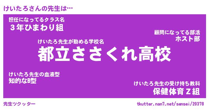 | 意味不明あだ名 | 『ペロリンけいたろ』『永久保存けいたろ』 |