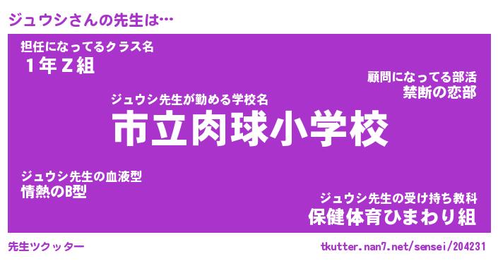 | 意味不明あだ名 | 『ペロリンジュウシ』『永久保存ジュウシ』 |
