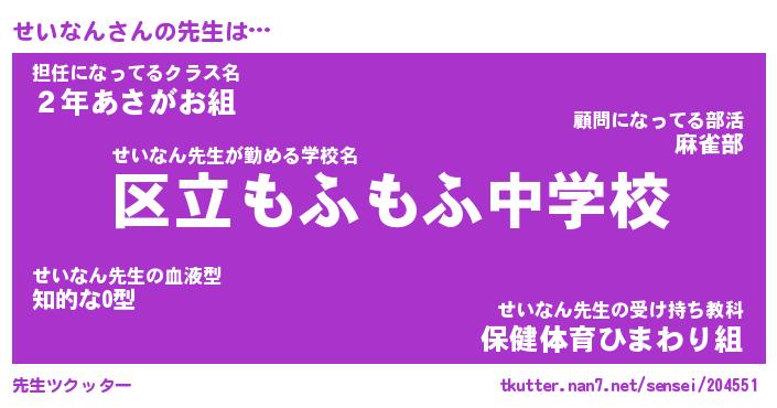 | 意味不明あだ名 | 『ペロリンせいなん』『永久保存せいなん』 |