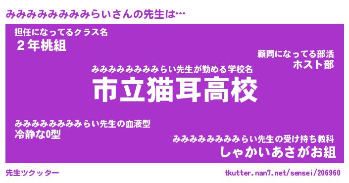 女子向けラノベタイトル風あだ名 | 『(仮)みみみみみみみみらいのやんごとなき事情』 |