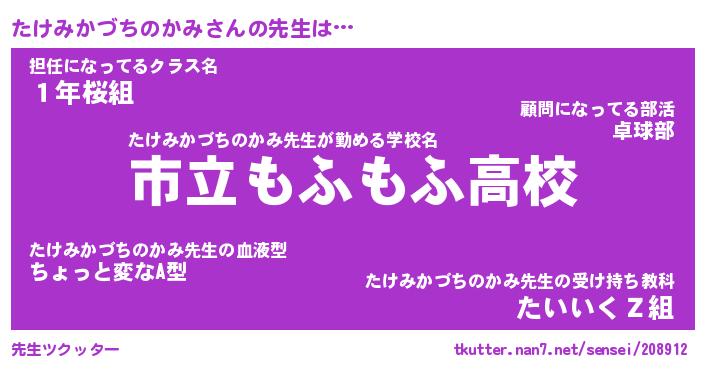 | ヘコむあだ名 | 『たけにゅー』『つくし』『たけを』 |