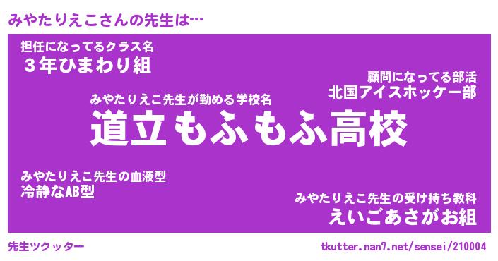 | 肩書あだ名 | 『みやたりえこ店長』『みやたりえこ塾長』 |