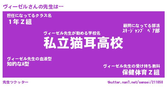 | 女子向けラノベタイトル風あだ名 | 『(仮)ヴィーゼルのやんごとなき事情』 |