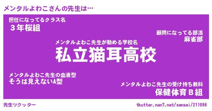 | 恥ずかしいあだ名 | 『プリティーメンタルよわこ』『メンちん』 |