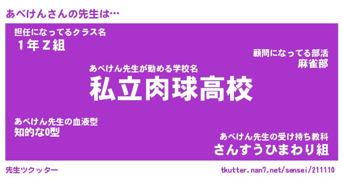 | 意味不明あだ名 | 『ペロリンあべけん』『永久保存あべけん』 |