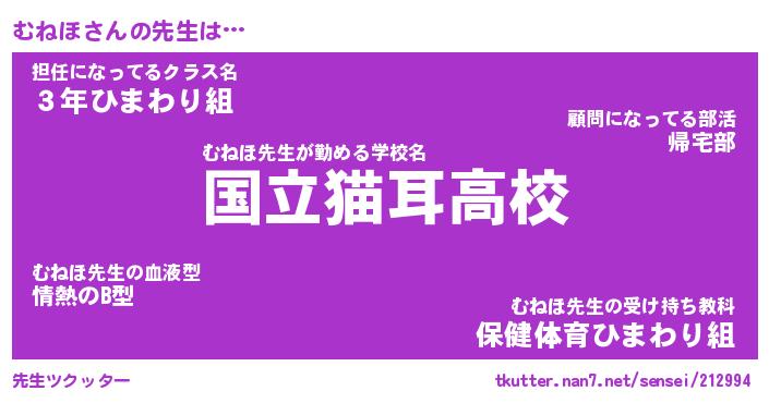 | ヘコむあだ名 | 『むねにー』『なまこ酢』『むね太郎』 |