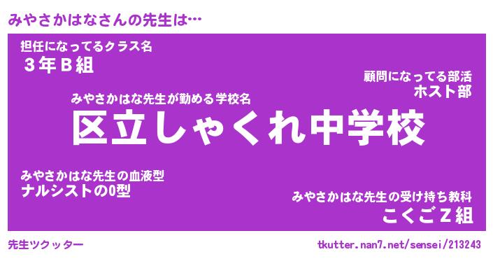 | ヒーロー風カッコイイあだ名 | 『スーパーミヤサカハナ』『炎刃騎士ミヤ』 |