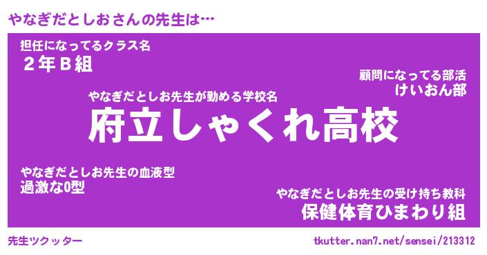 | 伝説のあだ名 | 『封印されしスナイパーやなぎだとしお』 |
