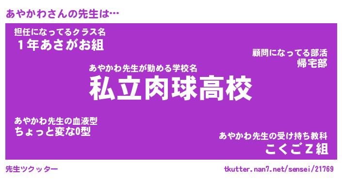 | 意味不明あだ名 | 『ペロリンあやかわ』『永久保存あやかわ』 |