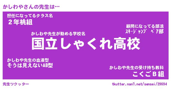 | 意味不明あだ名 | 『ペロリンかしわや』『永久保存かしわや』 |