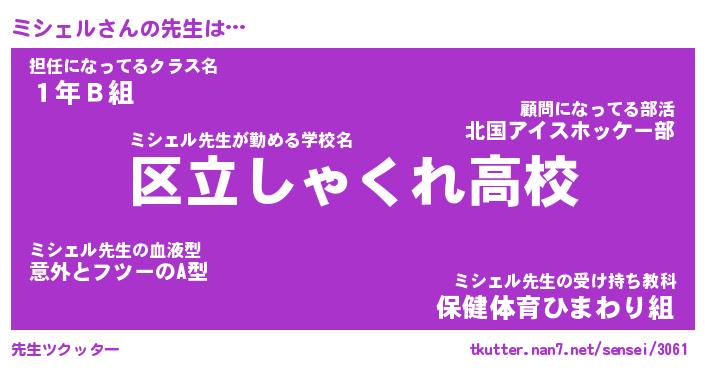 | 意味不明あだ名 | 『ペロリンミシェル』『永久保存ミシェル』 |
