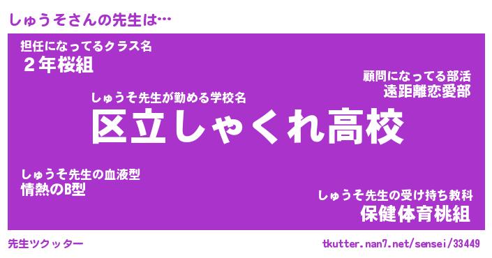 | 意味不明あだ名 | 『ペロリンしゅうそ』『永久保存しゅうそ』 |