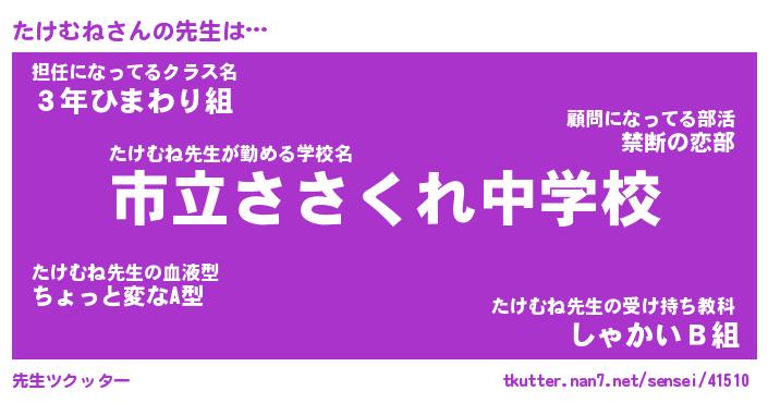 | 意味不明あだ名 | 『ペロリンたけむね』『永久保存たけむね』 |