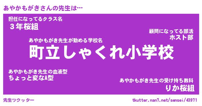 | ヒーロー風カッコイイあだ名 | 『スーパーアヤカモガキ』『魔戒騎士アヤ』 |