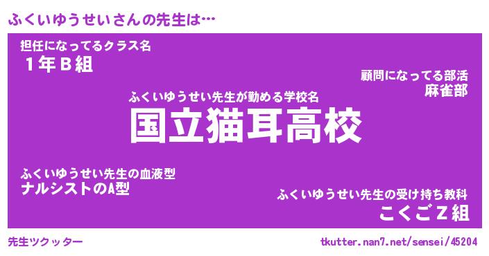 | 男性向けラノベタイトル風あだ名 | 『ふくいゆうせいの憂鬱』 |
