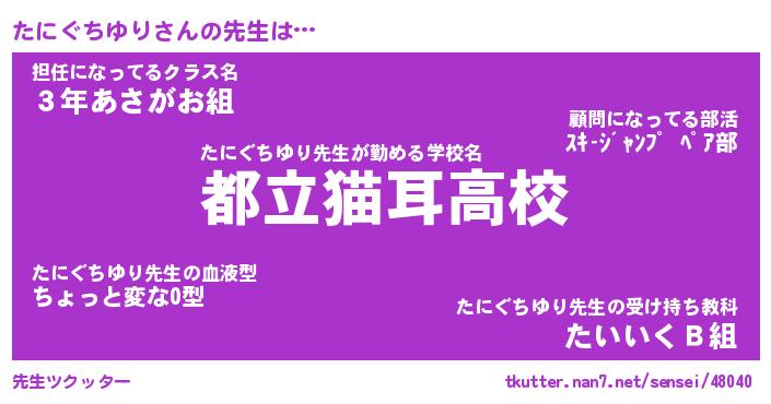 | ヒーロー風カッコイイあだ名 | 『スーパータニグチユリ』『天弓騎士タニ』 |