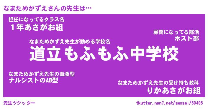 | 肩書あだ名 | 『なまためかずえ店長』 |