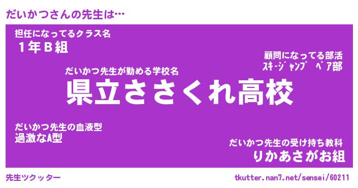 | 意味不明あだ名 | 『ペロリンだいかつ』『永久保存だいかつ』 |