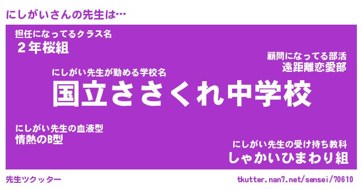 | ポケモン風あだ名 | 『ニシチュウ』『ニシガダネ』 |