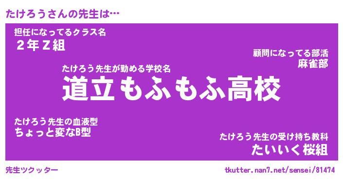 | ファンタジー風あだ名 | 『タケフェル』『エターナルタケロウー』 |