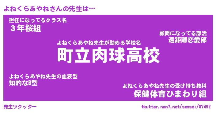 | 女子向けラノベタイトル風あだ名 | 『誰かこのよねくらあやねを説明してください! ~契約から始まるウェディング~』 |