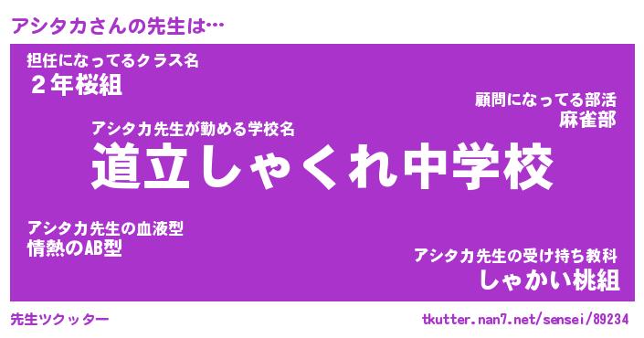 | 意味不明あだ名 | 『ペロリンアシタカ』『永久保存アシタカ』 |