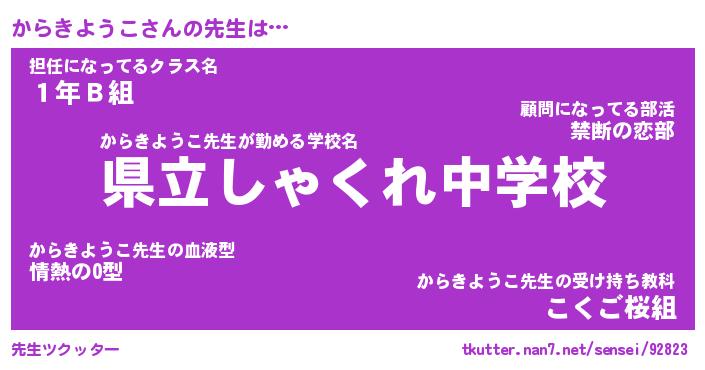 | ヒーロー風カッコイイあだ名 | 『スーパーカラキヨウコ』『銀牙騎士カラ』 |