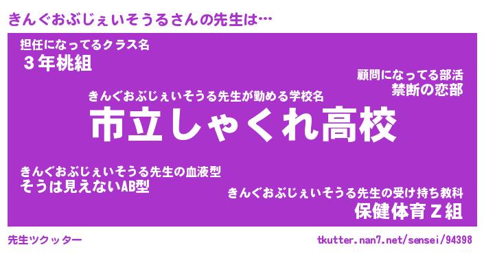 | 伝説のあだ名 | 『伝説のスナイパーきんぐおぶじぇいそうる』 |