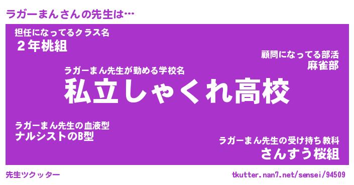 | 男性向けラノベタイトル風あだ名 | 『ラガーまんの憂鬱』 |