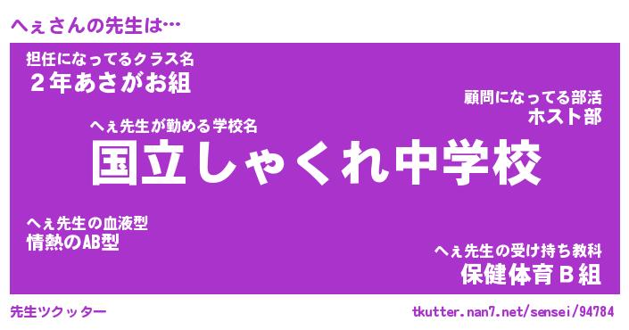 | 伝説のあだ名 | 『伝説のスナイパーへぇ』 |