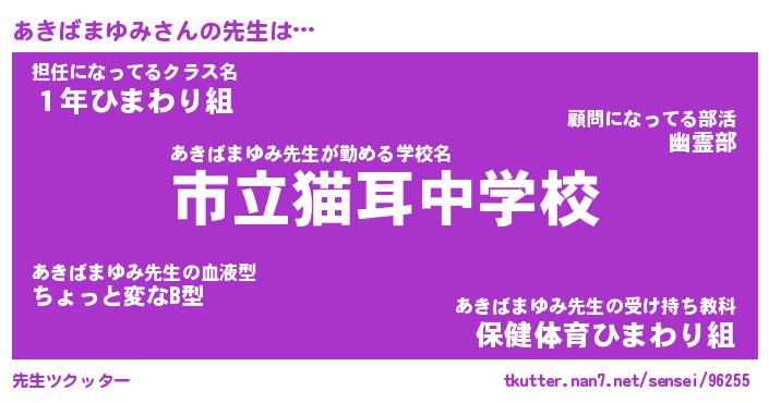 | 肩書あだ名 | 『あきばまゆみ社長』『あきばまゆみ班長』 |