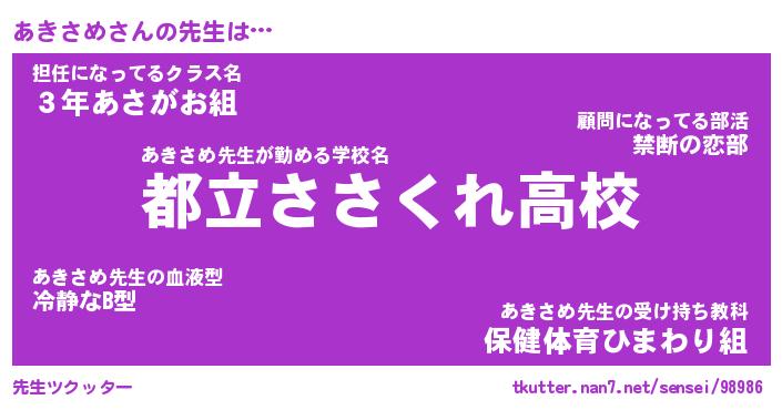 | ヘコむあだ名 | 『あきもー』『酢こんぶ』『あきっ子』 |