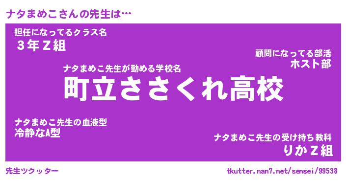| 伝説のあだ名 | 『封印されしスナイパーナタまめこ』 |