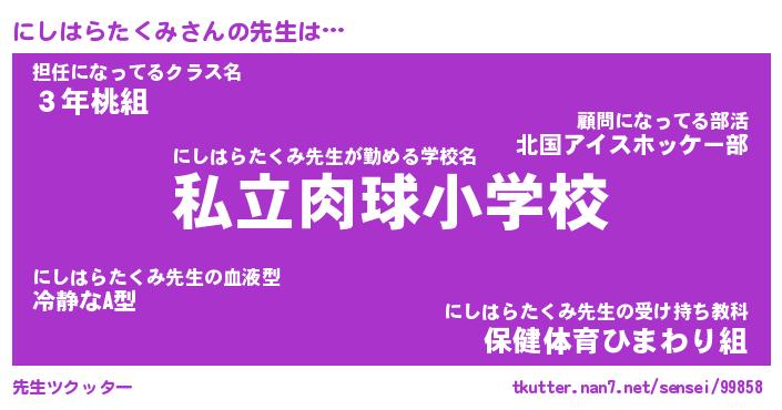 | ポケモン風あだ名 | 『ニシチュウ』『ニシハダネ』 |