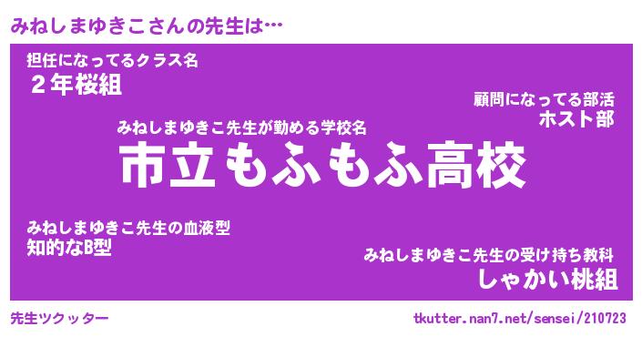 | 女子向けラノベタイトル風あだ名 | 『(仮)みねしまゆきこのやんごとなき事情』 |