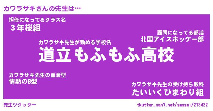 | ファンタジー風あだ名 | 『カワフェル』『エターナルカワラサキー』 |