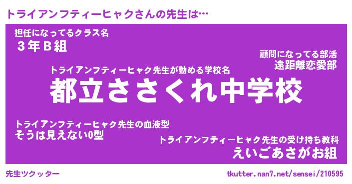 | 男性向けラノベタイトル風あだ名 | 『トライアンフティーヒャクの憂鬱』 |
