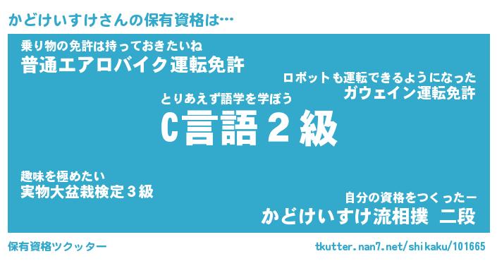 かどけいすけさんの保有資格は… とりあえず語学を学ぼう『C言語2級』乗り物の免許は持っておきたいね『普通エアロバイク運転免許』自分の資格をつくったー『かどけいすけ流相撲 二段』 ツクッター #保有資格ツクッター http://tkutter.nan7.net/shikaku/101665/
