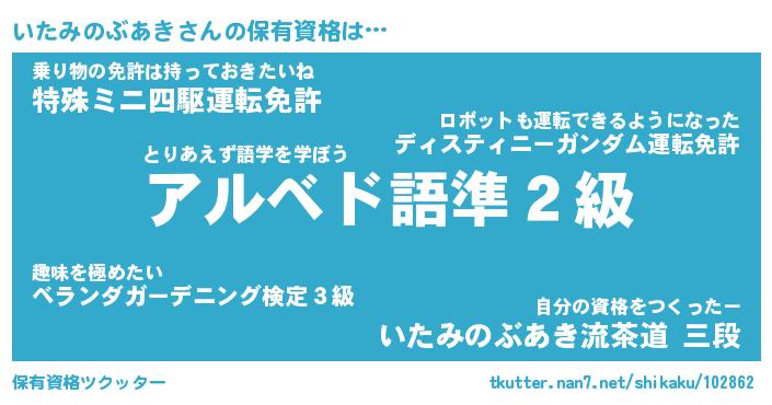 いたみのぶあきさんの保有資格は… とりあえず語学を学ぼう『アルベド語準2級』乗り物の免許は持っておきたいね『特殊ミニ四駆運転免許』自分の資格をつくったー『いたみのぶあき流茶道 三段』 ツクッター #保有資格ツクッター http://tkutter.nan7.net/shikaku/102862/