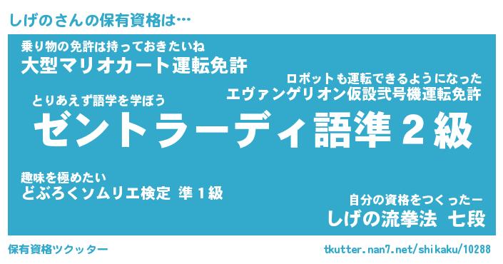 しげのさんの保有資格は… とりあえず語学を学ぼう『ゼントラーディ語準2級』乗り物の免許は持っておきたいね『大型マリオカート運転免許』自分の資格をつくったー『しげの流拳法 七段』 ツクッター #保有資格ツクッター http://tkutter.nan7.net/shikaku/10288/