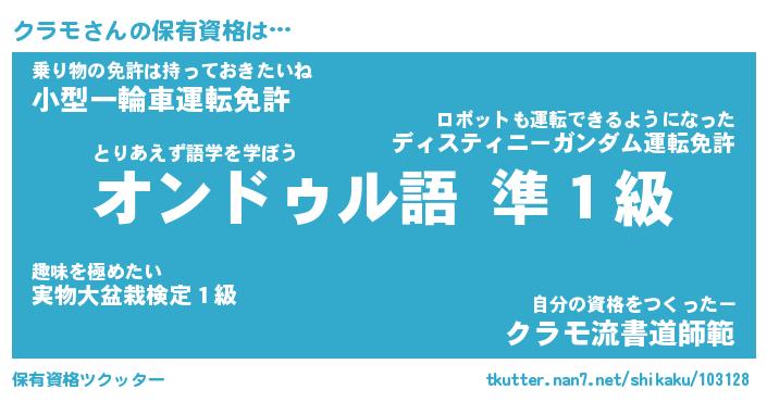 クラモさんの保有資格は… とりあえず語学を学ぼう『オンドゥル語 準1級』乗り物の免許は持っておきたいね『小型一輪車運転免許』自分の資格をつくったー『クラモ流書道師範』 ツクッター #保有資格ツクッター http://tkutter.nan7.net/shikaku/103128/