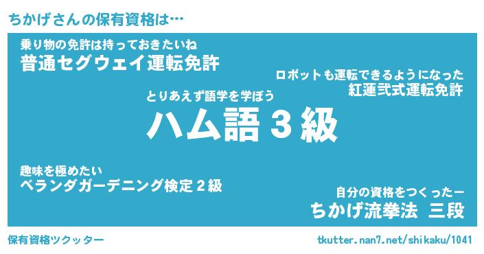 ちかげさんの保有資格は… とりあえず語学を学ぼう『ハム語3級』乗り物の免許は持っておきたいね『普通セグウェイ運転免許』自分の資格をつくったー『ちかげ流拳法 三段』 ツクッター #保有資格ツクッター http://tkutter.nan7.net/shikaku/1041/